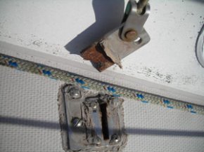 The scene regarding the crime: you can see the way the water got in at the top of the chainplate. The owners of this watercraft thought their rig was at sound condition! Rust never sleeps (to quote Neil teenage). Images: Ann Levine
